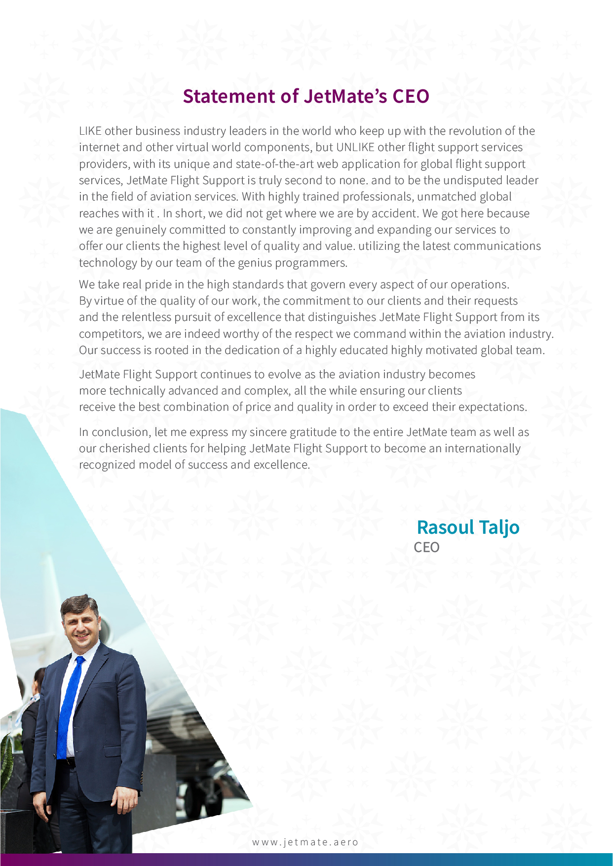 JetMate presents its unique and state-of-the-art web application for global flight support services and a plenty of experience in trip planning designed to cover your comprehensive needs and the needs of your clients and the business objectives they serve.